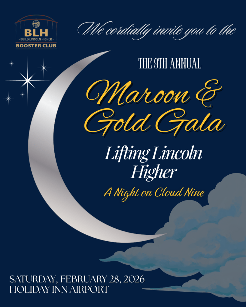 This year’s theme is “Lifting Lincoln Higher: A Night on Cloud Nine.” Dress to party under the stars (indoors at the Holiday Inn – Airport) on Saturday, February 28, 2026. Doors will open at 5 PM, followed by time to browse the Silent and Live Auction Items and enjoy a drink. A plated dinner, two Athletic Hall of Fame inductions, and some fun games will follow. Most importantly, you’ll enjoy a night out AND help the booster club support all clubs and activities at Lincoln High School.